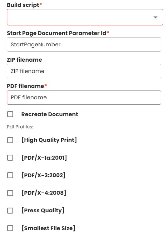 2.5 Script, Pdf Profiles, Page Number Param, Zip name and Recreate Document flag form