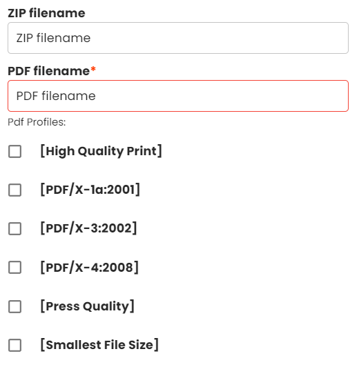 The method generates the panel with two text fields to enter the ZIP filename and PDF filename and the list of available InDesign profile as above.