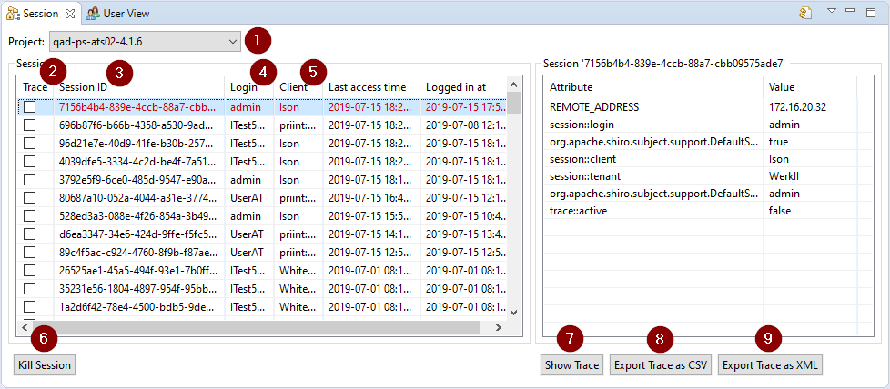 The view Session lists all current sessions on a chosen pubserver (1). The red one is used from the active ison. The right part of the view shows the session attributes of the selected session. The first column (2) shows whether tracing is active for the session. Here you can activate and deactivate tracing. Next columns show session identifier (3), login (4) and client application (5).