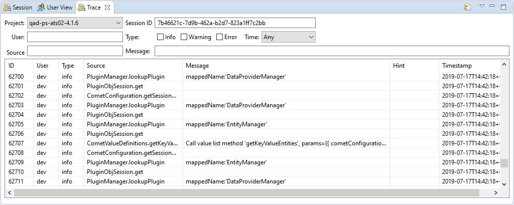 The view Trace shows tracing messages from the executed methods for a selected session. The fields in the upper part can filter the messages.