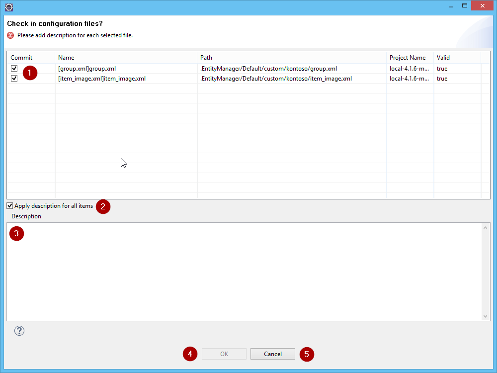 After entering a description for every check-in, the OK button (4) is enabled and you can execute the check-in. The Cancel button (5) cancels the operation.
