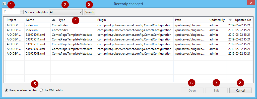 In the context menus of Entity, Data Provider, Comet and Repository Explorer there is the command Recent XMLs. It provides a search for recently changed configuration files.