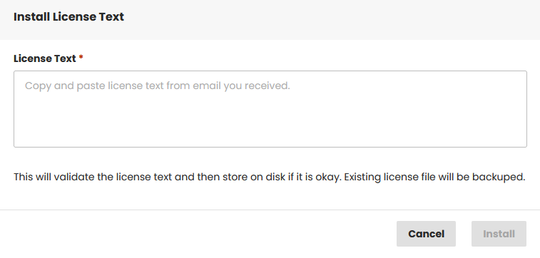 Press the button "Install". Then it will validate the license text and store on disk if it is okay. A previously existing license file will be backed up.