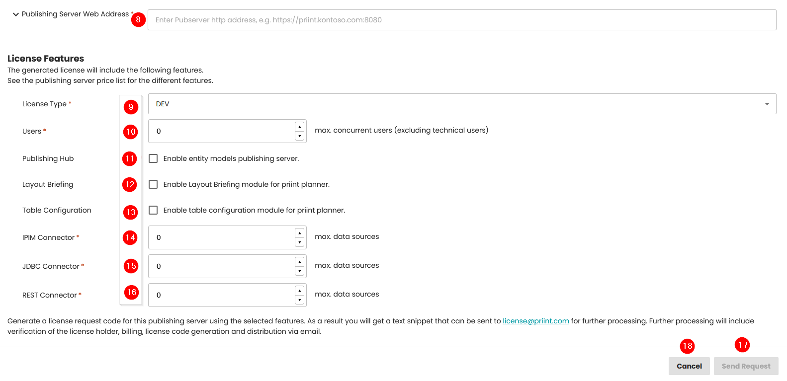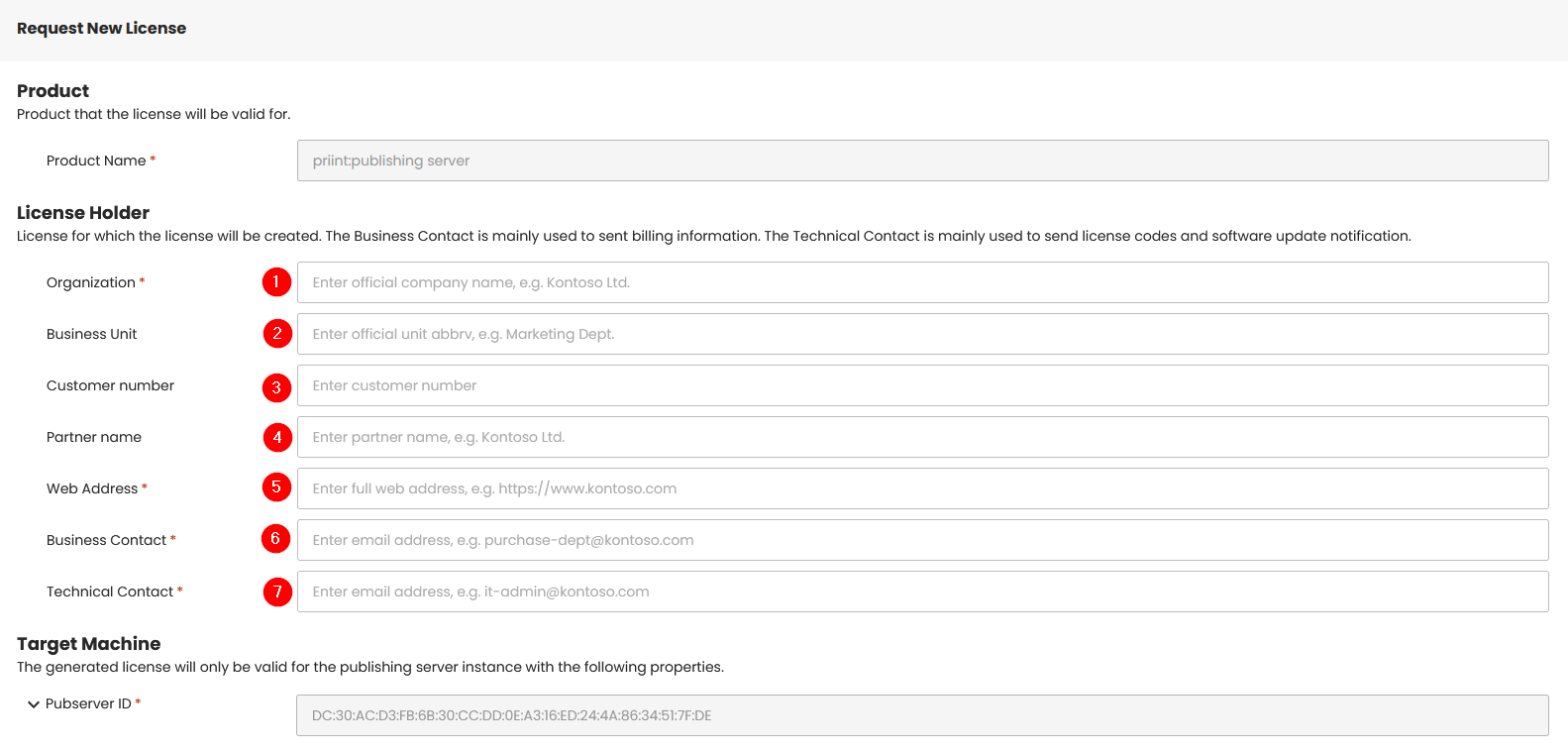 | 8 | Web address of the priint:publishing server which is used by your publishing server users. The license will only work for this address. If your browser runs on the same machine as the priint:publishing server, the URL localhost:<port> will work as well. Please note, that you must enter a port, but the port can be changed later without requesting a new license, since the port number is not compared. | yes | https://kontoso.com:8080 |