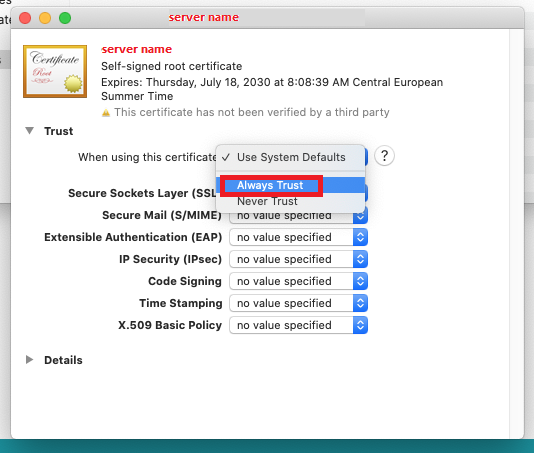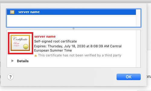 If the certificate changes, Safari may throw a message "Safari can’t open the page because Safari can’t establish a secure connection to the server server.name ". In such a case, delete the certificate and repeat the steps.