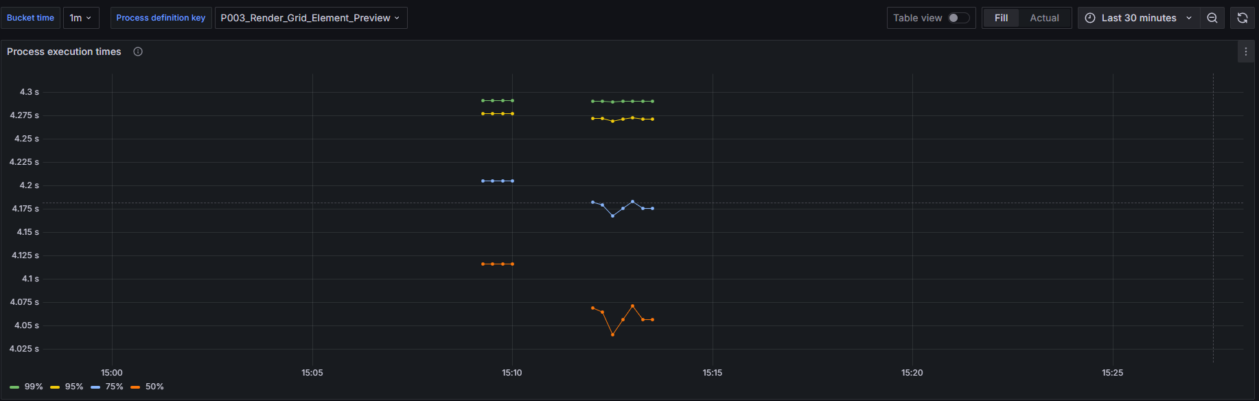 This metric visualizes rendering job execution times, grouped by process definition keys, and shows the 99th, 95th, 75th, and 50th (median) percentiles. It helps identify performance patterns and bottlenecks in rendering processes.