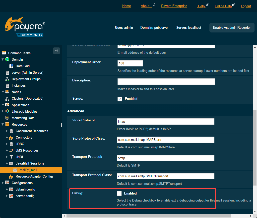| JNDI Name | mail/gf_mail | Important: do not change this name |
