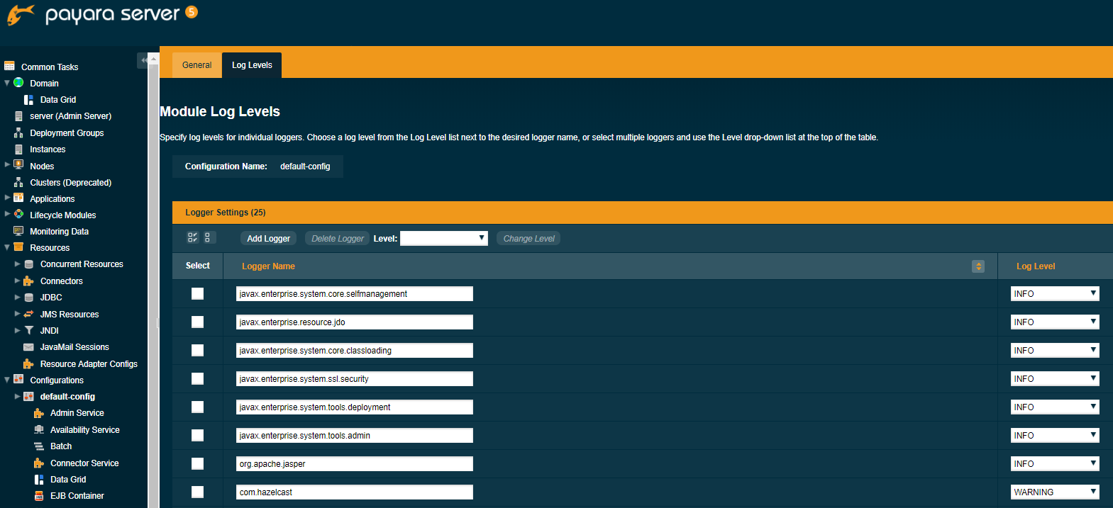 Do not use WebConsole > Configurations > server-config > Logger Settings > Log Levels for this task. You can only configure the build-in Payara packages this way. You cannot configure the publishing server related packages here. Please use <domain>/config/logback.xml file to configure individual loggers.