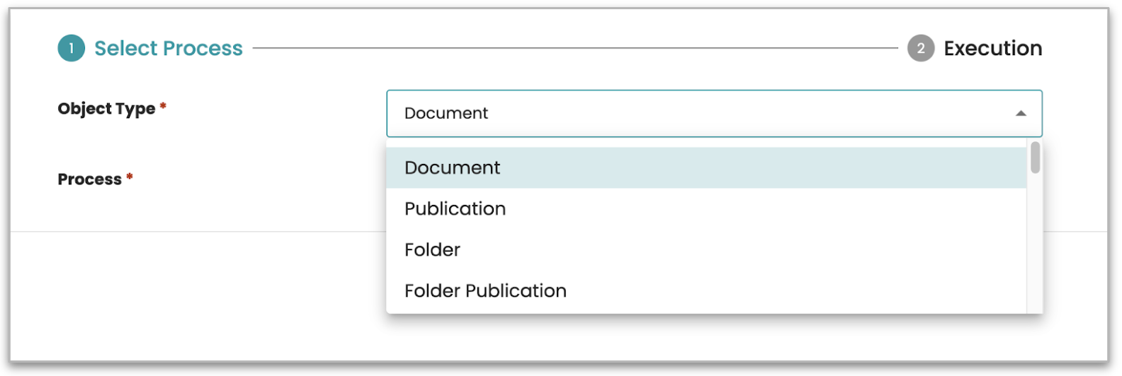 Object Type: When you open the form, the Object Type dropdown will appear at the top. This dropdown lets you choose the type you want to manage. After selecting an Object Type, the process will automatically update to display only the available processes based on your selection.