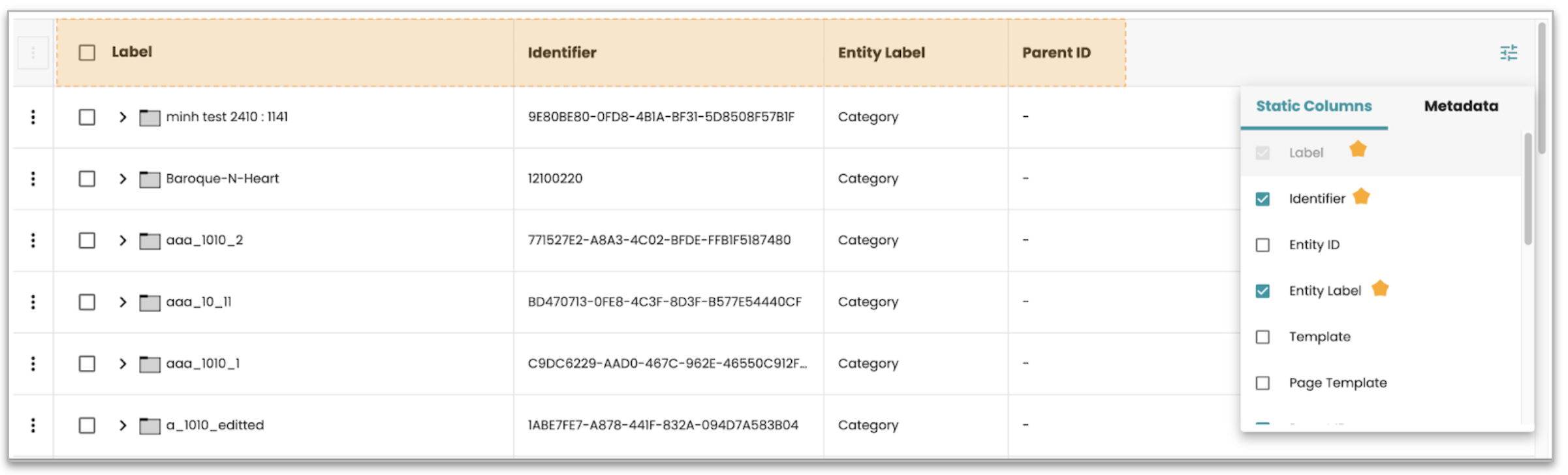 A list of available attributes will be displayed in 2 tabs, including options like Label, Identifier, Entity ID, Entity Label, Template, and Page Template.