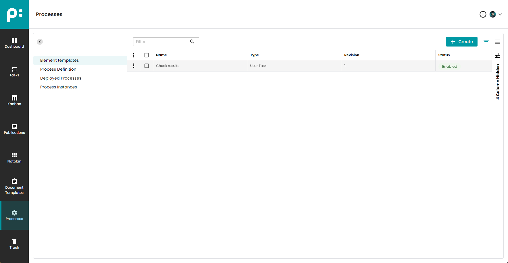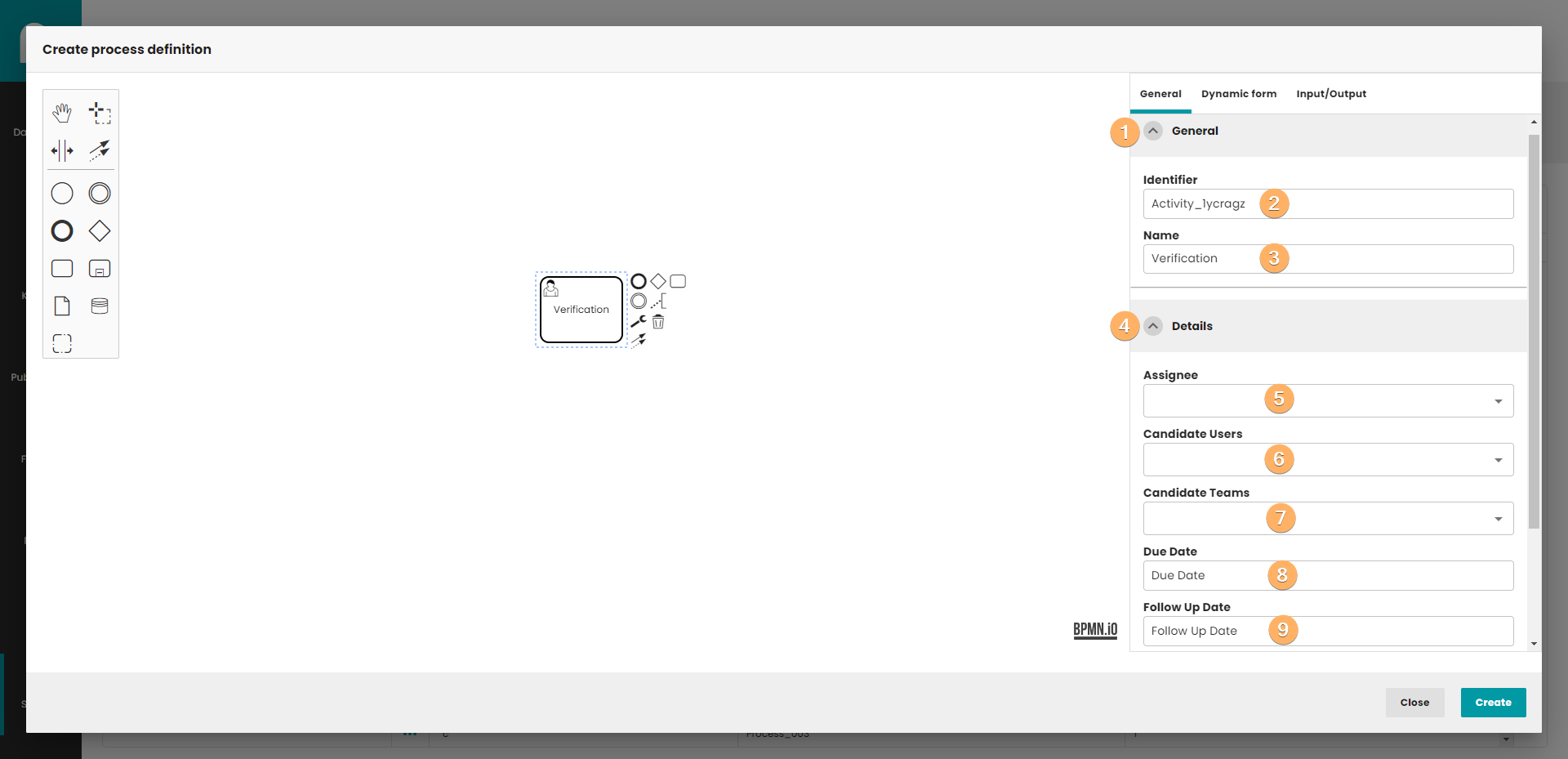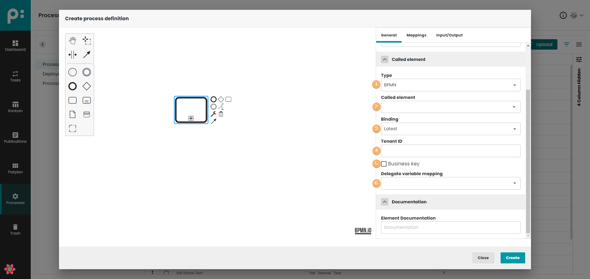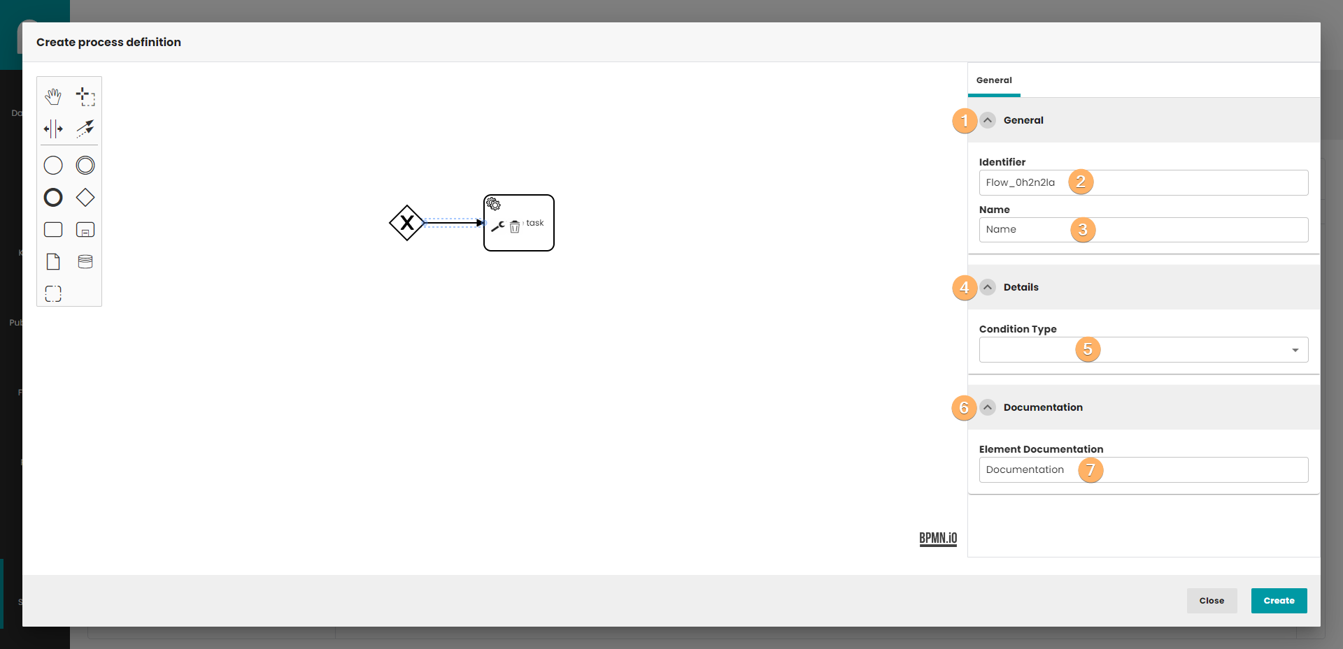 - Create process definition button. When you click on this button, process definition will be saved in database. The process do not need to be finished. If you edit process definition, the Create button is replaced by the Update button. Update button create new version of process definition, so you can easily go back to previous version of process.