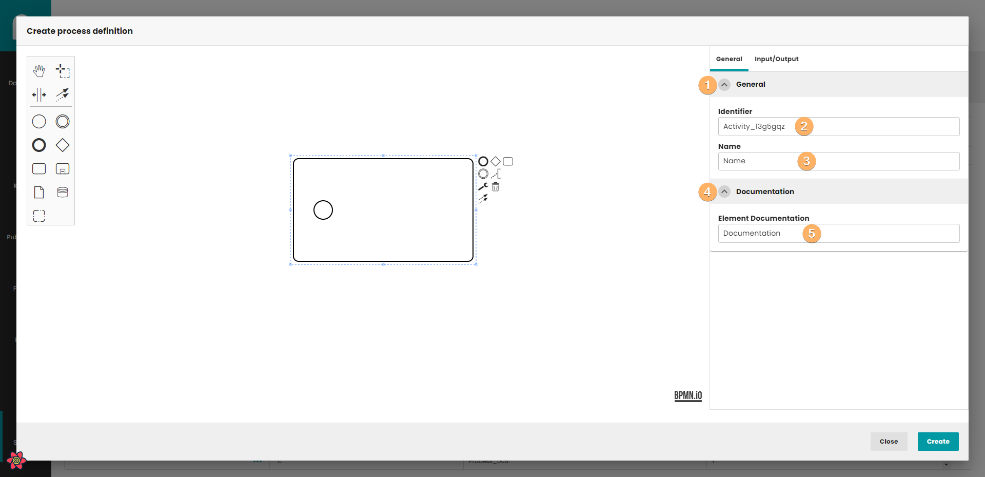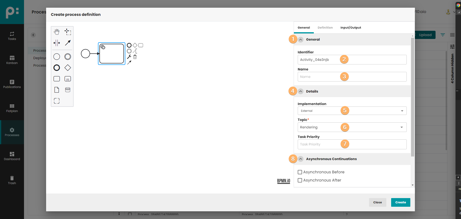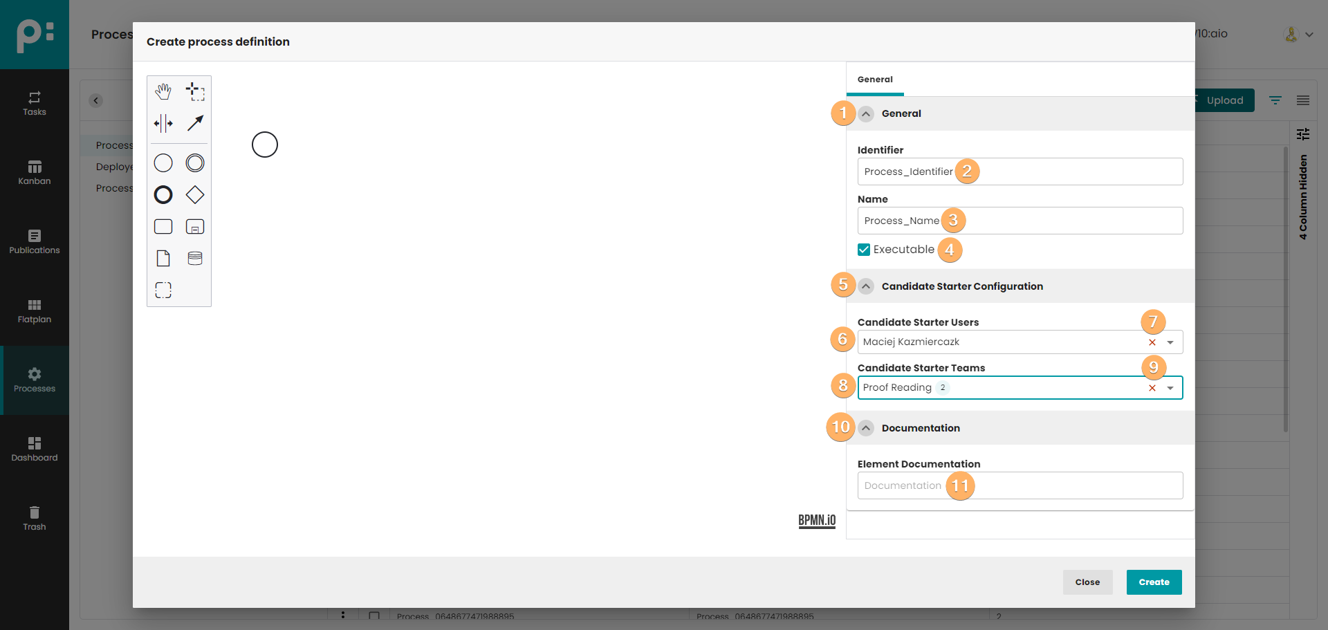 - Canvas with process definition. You can use When you click on this field, you can edit basic information about process definition.