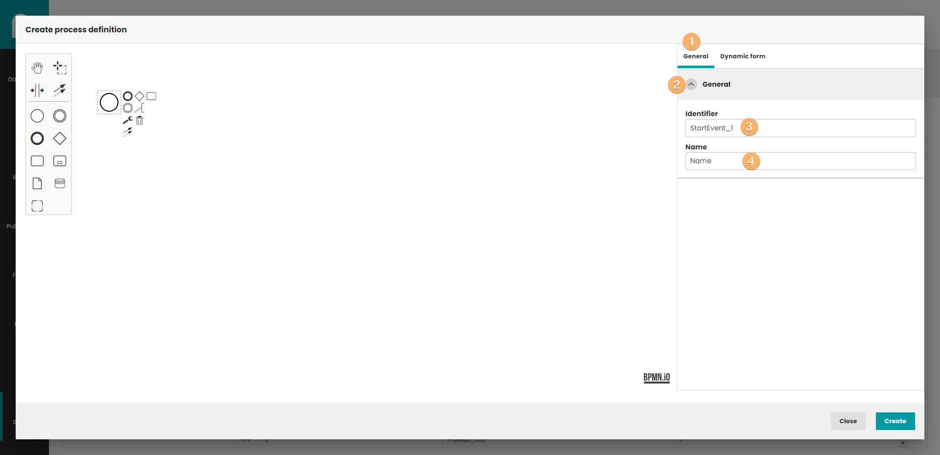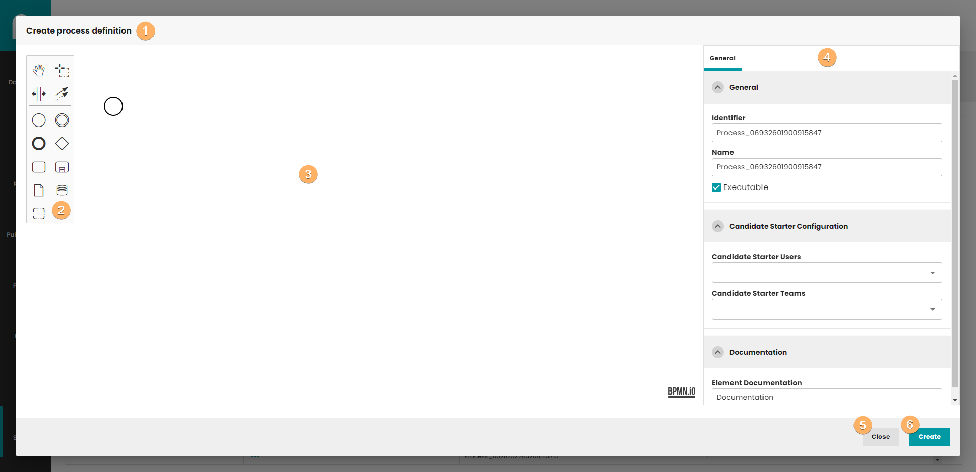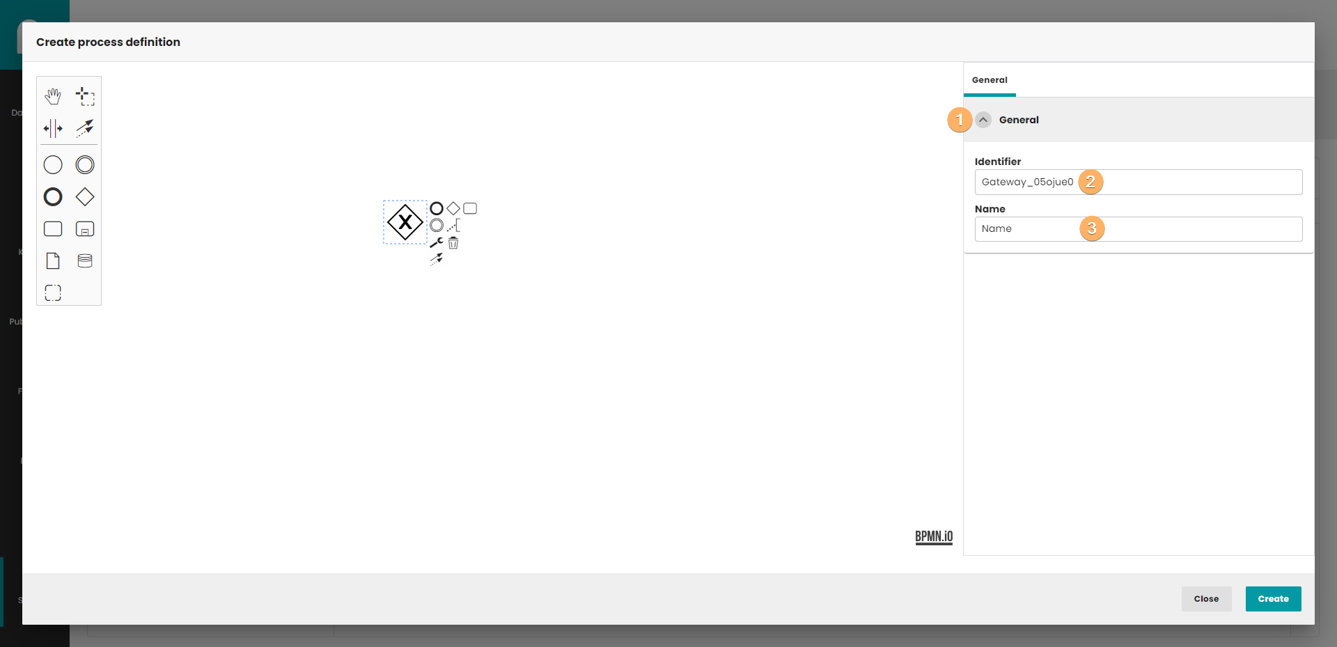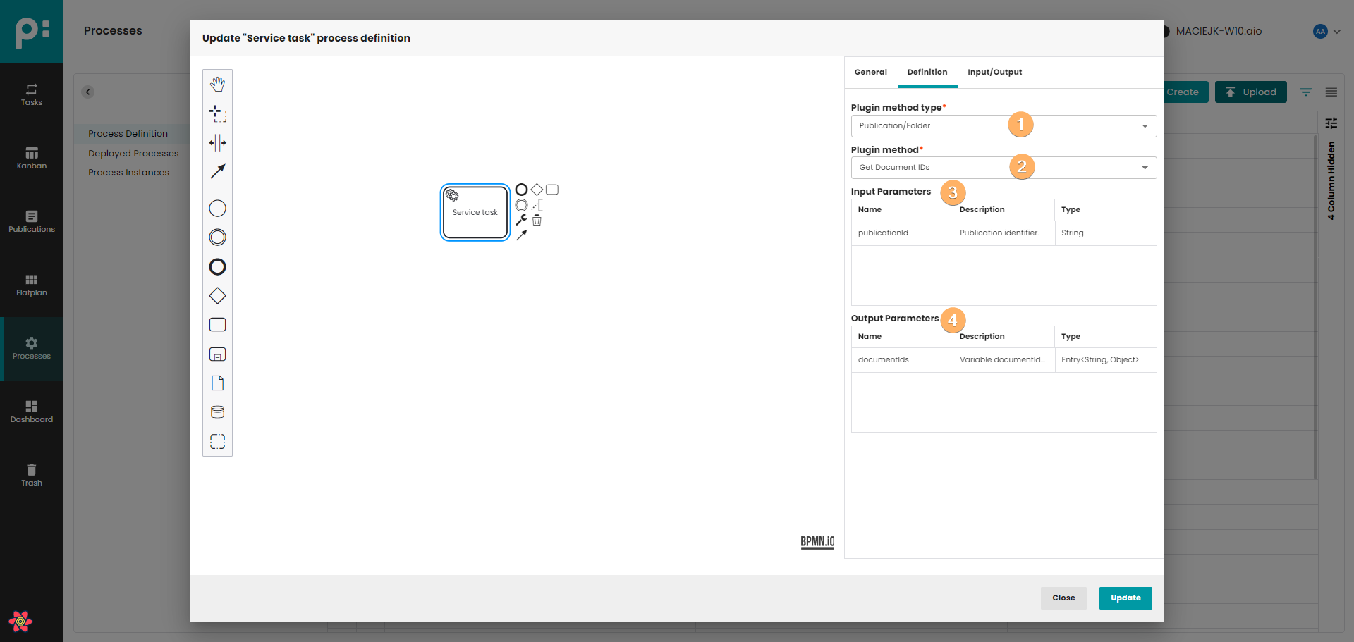 - Canvas with process definition. You can use When you click on this field, you can edit basic information about process definition.