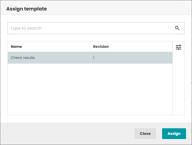 After pressing the button, a window will be displayed with a list of templates available for the given task type and status (enabled). Only templates with the highest revision number will appear. After selecting a template and pressing the "Assign" button, the template will replace the task it was selected for. All properties will be overwritten except the identifier.