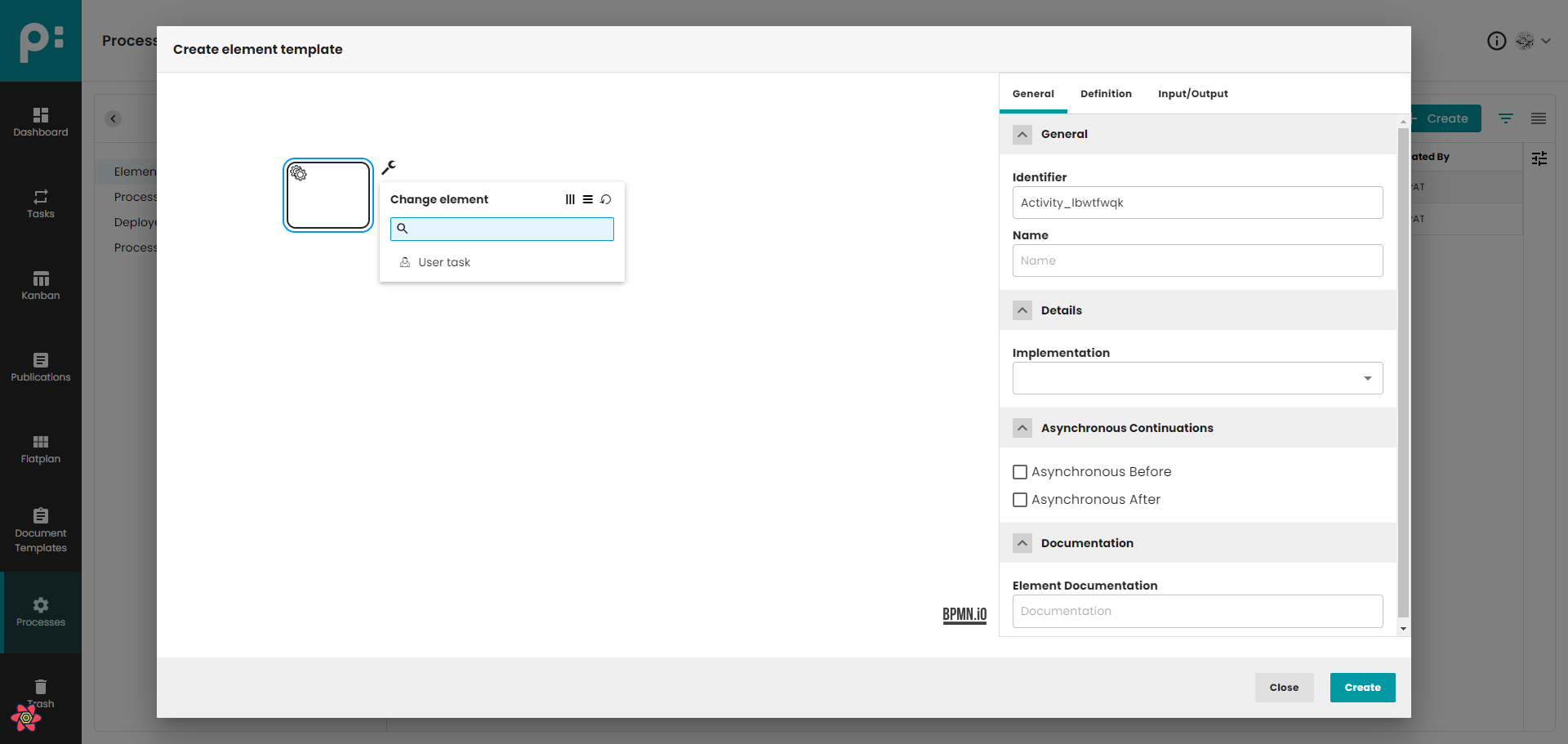 - Create a new process by clicking the Create button. The process editor explained below will open with a start event only.