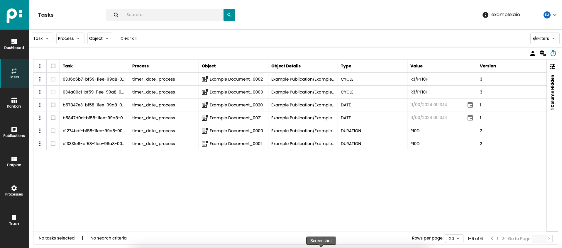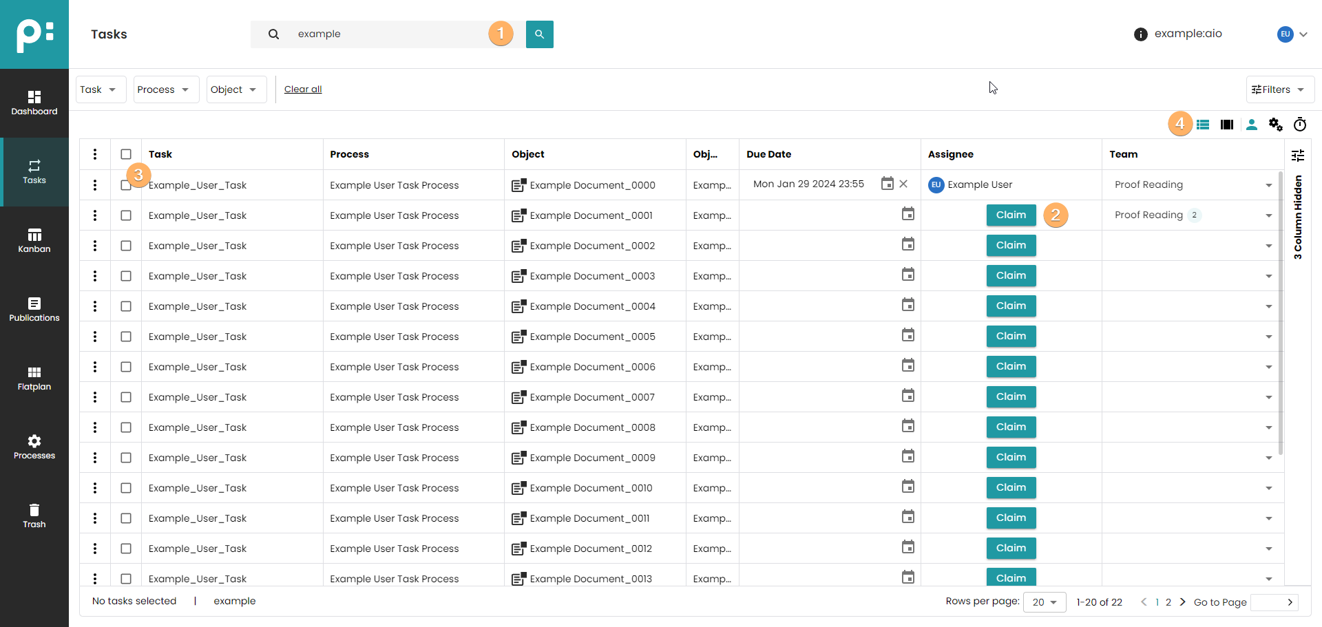 - The search filters the tasks by the task name. With an empty search field every task relevant for the current user is displayed. For more detailed filtering, please use the standard filter functionality below the search bar.